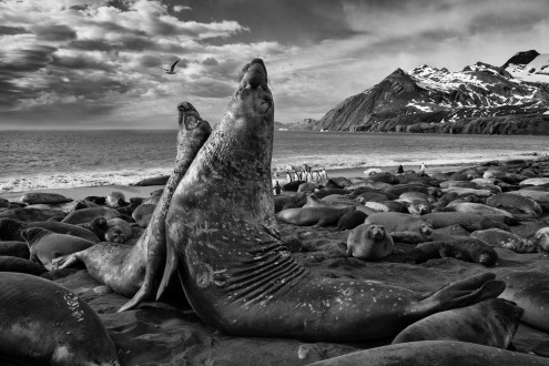 With the highest biodensity of life anywhere in the world, thousands of elephant seals and king penguins line the beaches of South Georgia, Antarctica.